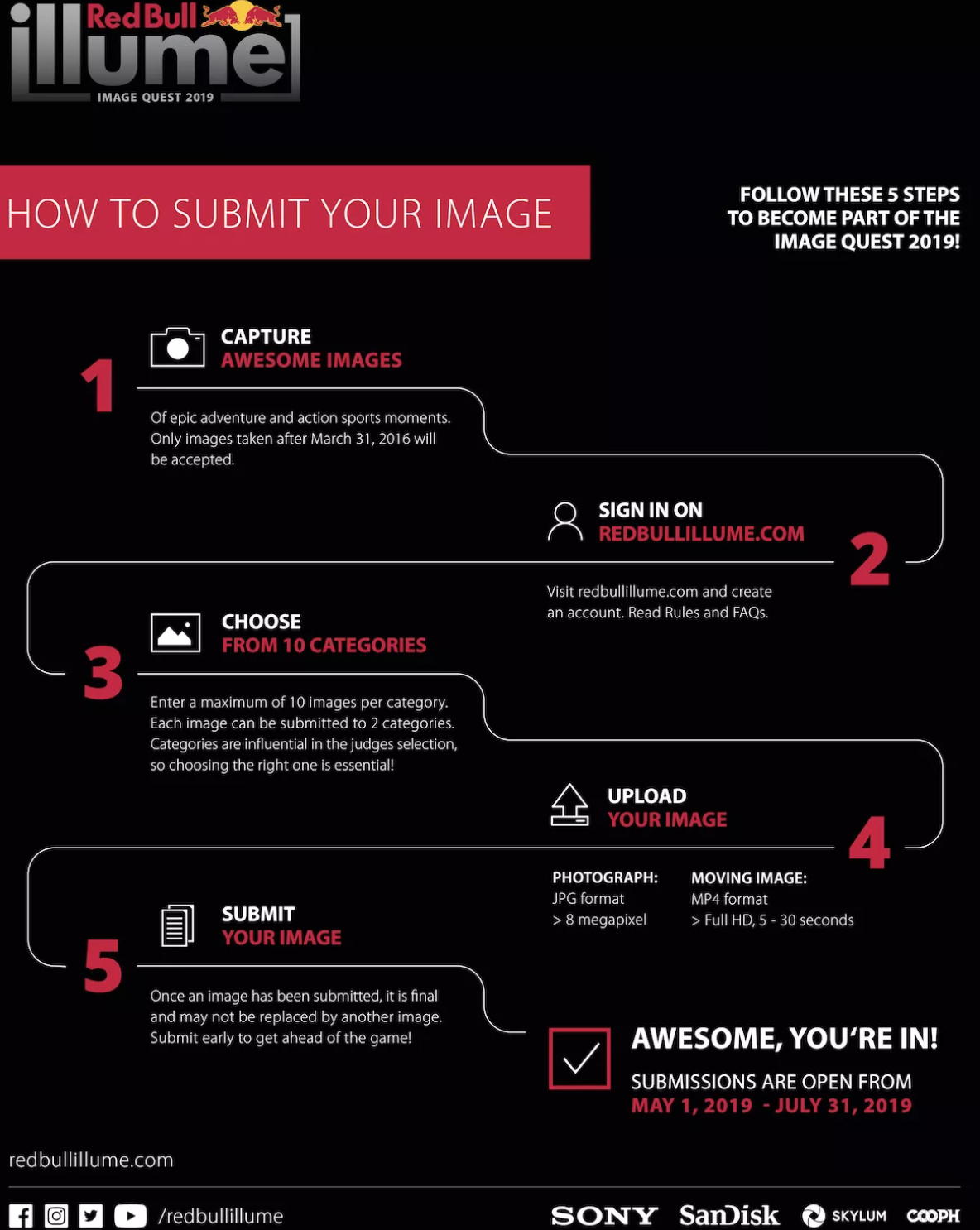 Die Image Quest 2019 ist die fünfte Ausgabe und enthält zwei neue Kategorien. Best of Instagram by SanDisk und die Moving Image Kategorie. Die fünf monatlichen Gewinner von Best of Instagram by SanDisk wurden bereits bekanntgegeben, während Aufnahmen für die Moving Image- und die anderen neun Kategorien des Hauptwettbewerbs bis zum 31. Juli 2019 auf redbullillume.com eingereicht werden können.